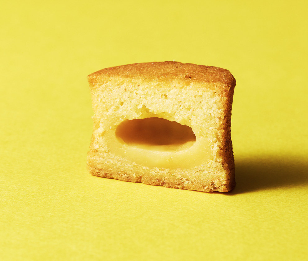 - ニュージーランド産のグラスフェッドバターを使用し、食感の異なる2つの生地、ガレット・ブルトンヌとフィナンシェにミルクジャムを挟み三層仕立てで焼き上げました。バターの味わいを引き出すため、フィナンシェにはヘーゼルナッツのような色になるまで熱した焦がしバターをたっぷり入れました。ミルクジャムにはバターを作る過程で生まれる副産物のひとつである脱脂粉乳を使い、食材を余すことなく美味しく食べられるよう工夫しました。